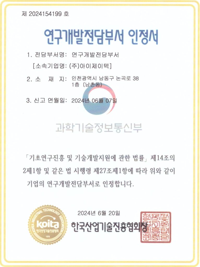 아이제이텍은 공식 인증된 기업부설 연구개발 전담부서를 통해